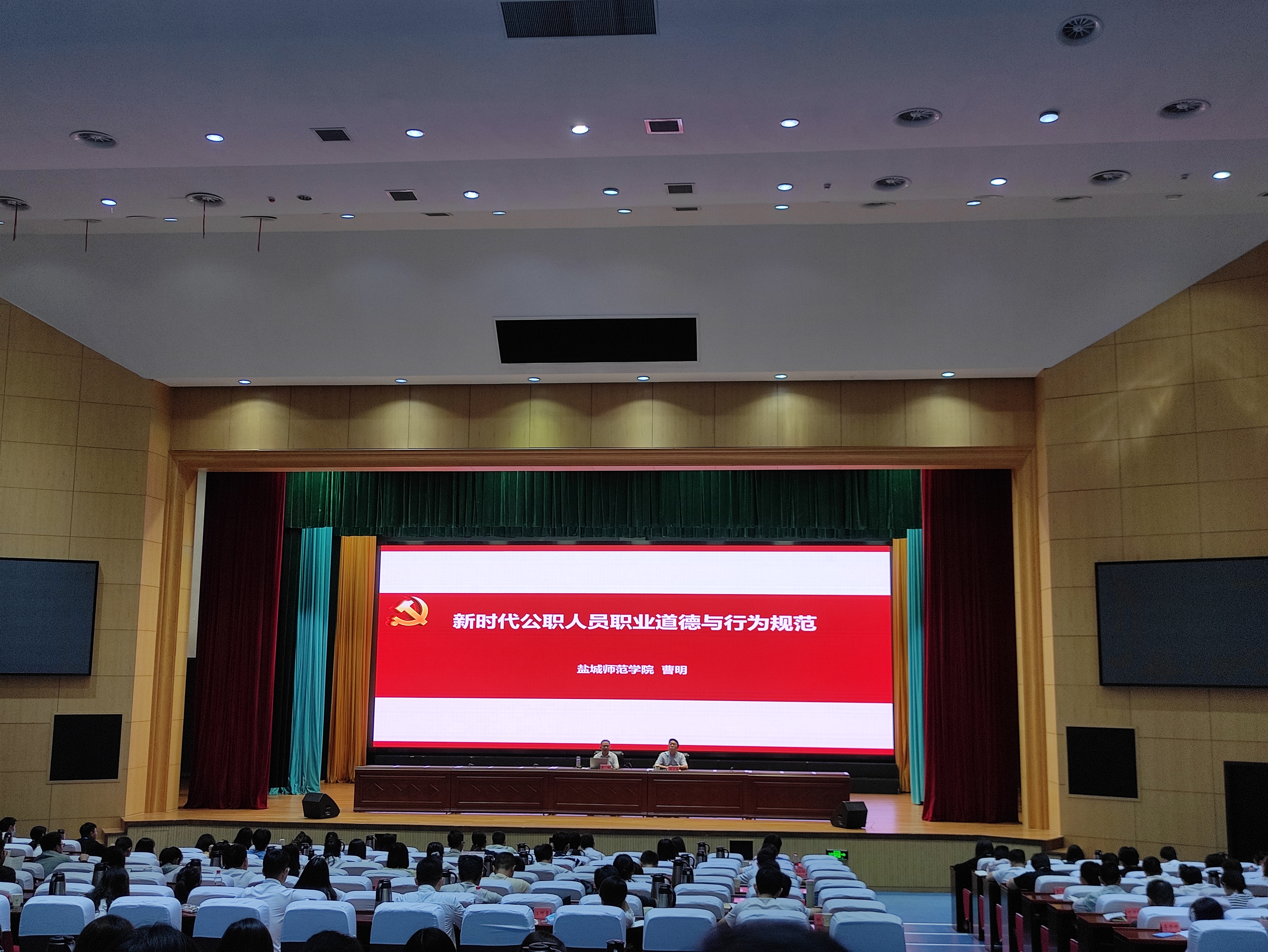 9月5日上午8:30到11:30,盐城师范学院曹明教授在学术报告厅给大家讲解《新时代公职人员职业道德与行为规范》,通过案例让大家了解目前部分公职人员工作中存在的失德行为及其对个人和社会的危害,进而让大家熟知遵守职业道德与行为规范的重要性。习近平总书记自十八大以来对党员干部提出了诸多要求,作为新入职的公职人员,在之后的工作中只有不断加强党性修养,坚定理想信念,恪尽职守,才能更好地服务人民,为建设美好祖国贡献自己的力量。